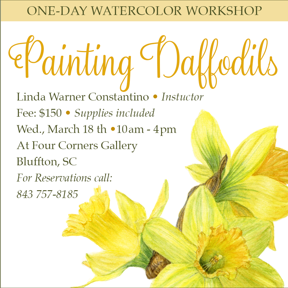 This one-day watercolor workshop will explore the challenges of painting yellows using the wonderful daffodills that are hearalding spring all around the Lowcountry. Join me at the Bluffton Gallery of Fine Art and Framing for day of honing your watercolor skills. Just call the gallery at 843 757-8185 to reserve your place. Price $175 with all supplies included. 10 am - 4 pm Note: Basic observational drawing skills required.